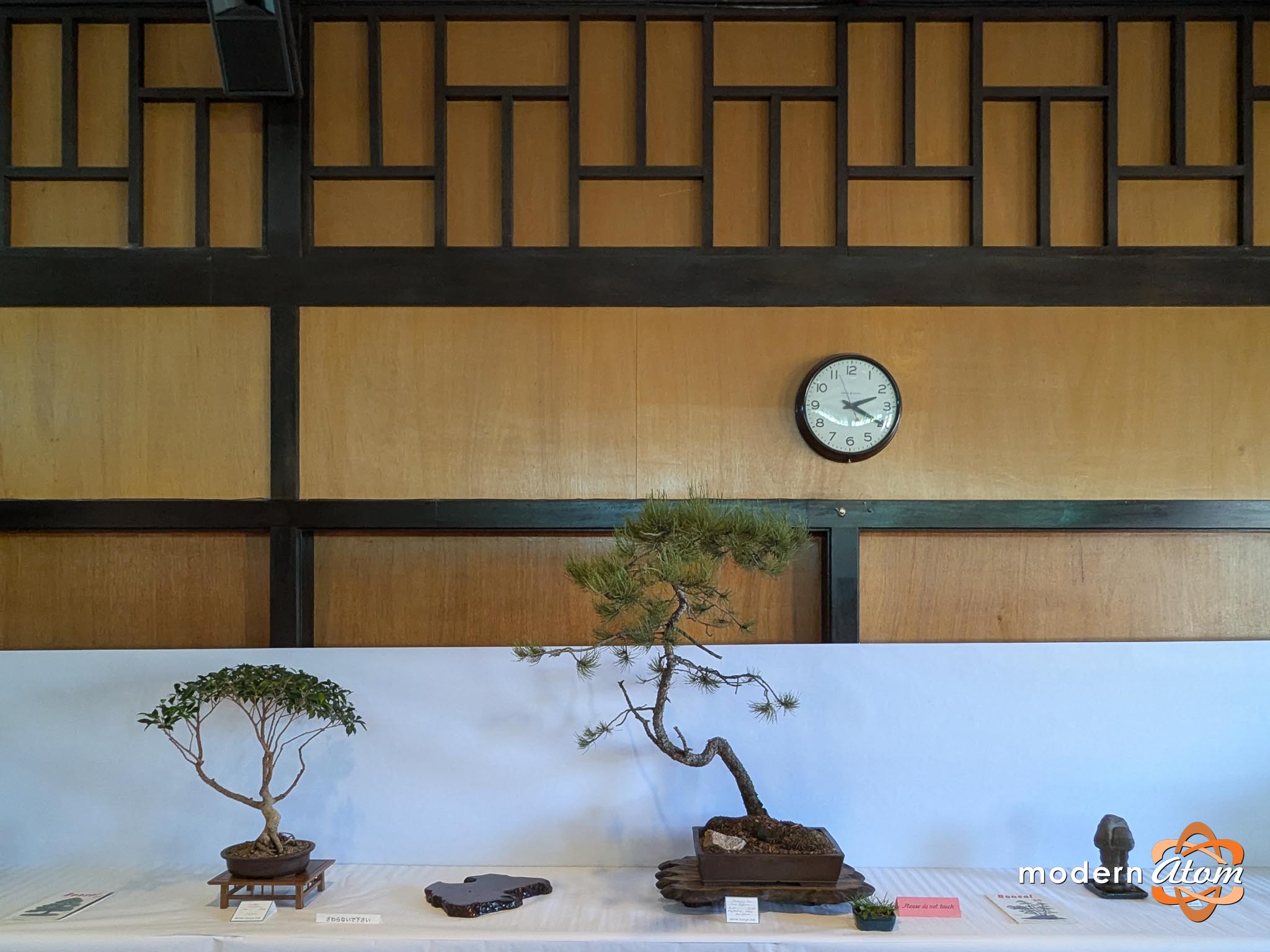 Outside is a tiled “irimoya” style roof (a Japanese style roof that is similar to a Dutch gable) on each of the pavilions, which floats over the walls on a band of stained clerestory windows. Below are gridded concrete wall panels occasionally interrupted by full height gridded glass and highly ornamented doors.