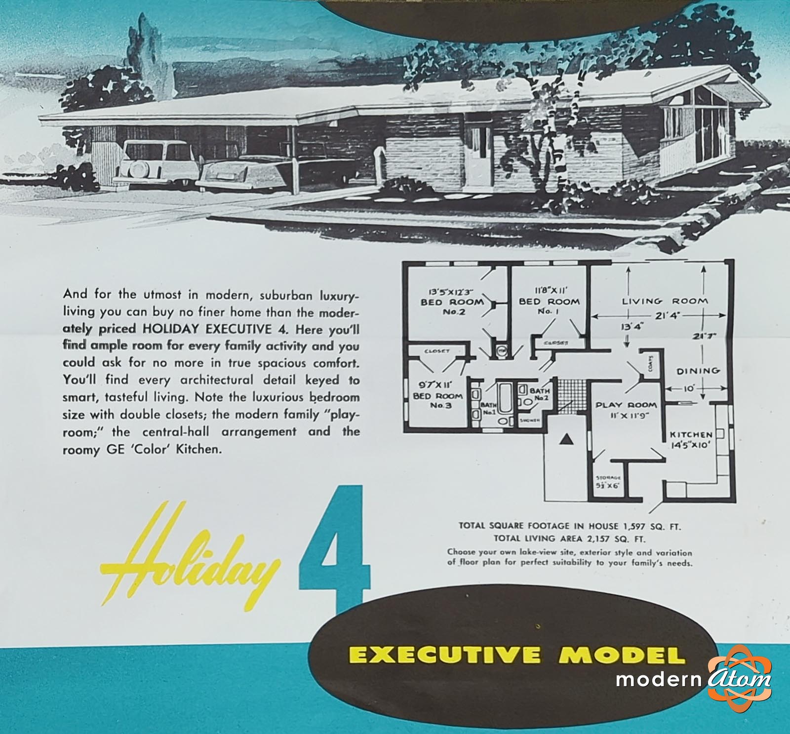 In 1955, Carey Construction Co. introduced a follow-up pair of models to the original Holiday Homes product line (they did continue to build the original Holiday Homes at the same time). The “Executive” models were said to be targeted toward the young executive – the homebuyer who wanted more space and amenities than the original Carey Holiday Homes offered – dramatic vaulted ceilings with window walls and fantastic clerestory windows, and a generous eat-in kitchen to replace the too-small kitchen of the original Holiday homes – plus a 2-car carport in one of the models, all set in a location of Harvey Park with views of Riviera Circle Lake, which Carey was developing at the same time as a private lakefront custom home community—the model home for the Carey Holiday Homes Executive Models doubled as the sales office for the Riviera Circle Lake community (which is also where the Carey family made their home in Harvey park for over a decade).