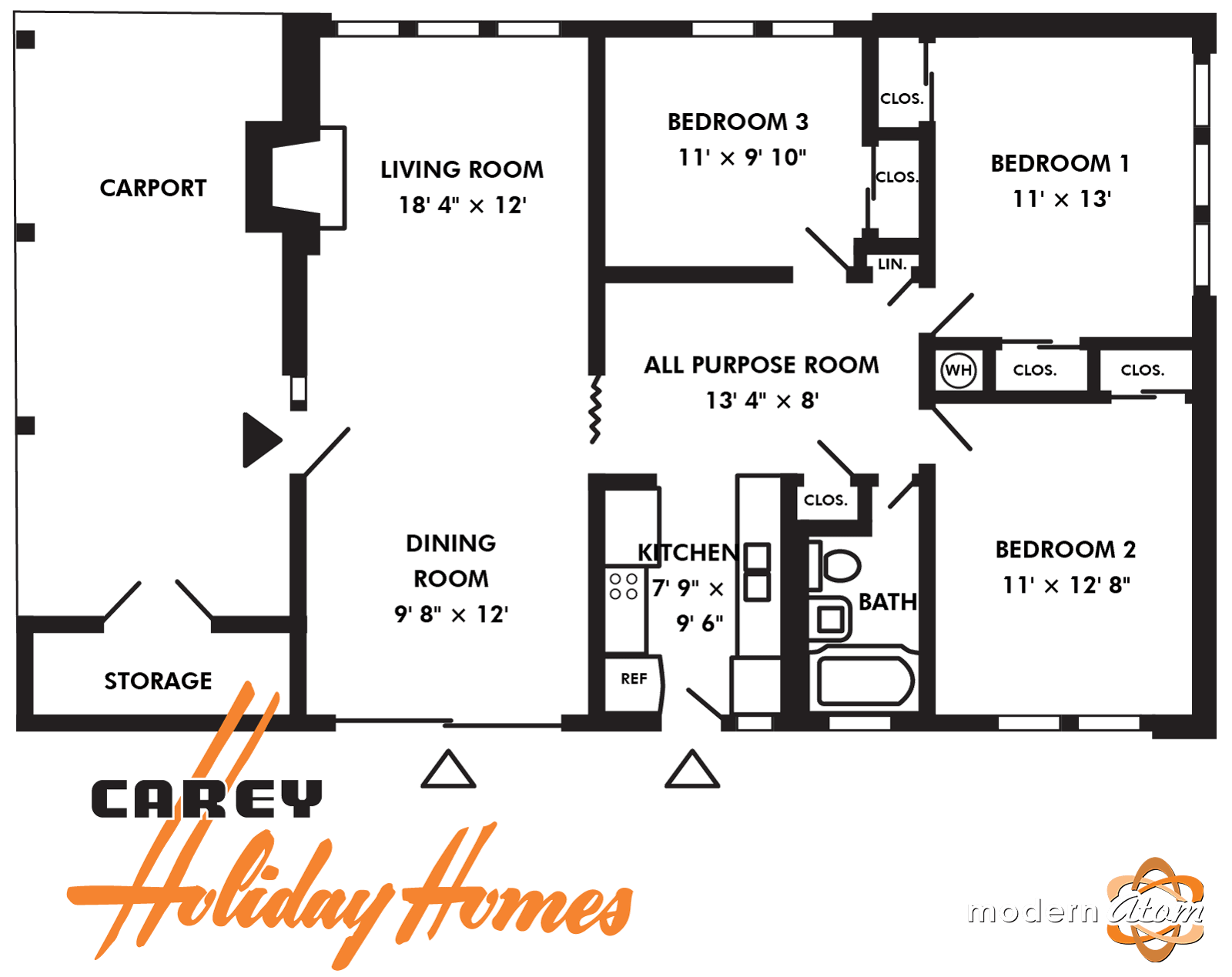 The Holiday Executive 3 is a super-sized version of the original Carey Holiday Homes 3-bedroom plan. It does away with the multi-purpose room idea, and instead puts that space into a huge eat-in kitchen. and space for a basement stair that doesn’t rob space from the smallest bedroom. All of the bedrooms are well-sized, and the primary bedroom gets its own bathroom. These homes generally feature an attached one-car carport.